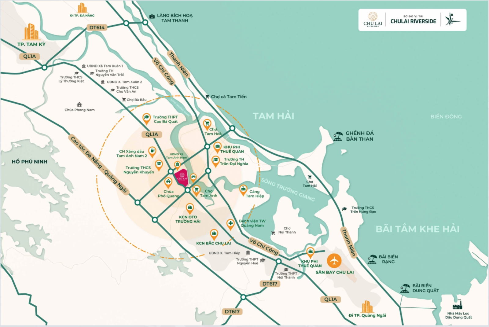 Dự án Chu Lai Riverside là một trong những khu đô thị mới của khu kinh tế Chu Lai, thị trấn Núi Thành – Quảng Nam. Sở hữu một vị trí vô cùng chiến lược ngay vùng kinh tế trọng điểm của khu vực miền Trung. Với một mặt giáp tuyến đường giao thương Quốc Lộ 1A, một mặt giáp con sông Trường Giang huyền thoại, dự án Chu Lai Riverside như một viên kim cương thô mới được chế tác, hứa hẹn sẽ là một nơi an cư thịnh vượng, một cuộc sống thoáng đãng bên dòng sông huyền thoại .
